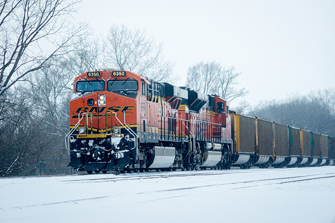 Locomotive Electrician Andy Ringsmuth braved the chill of a Nebraska winter to take this photo of a BNSF train rolling through Lincoln, cutting across frosty fields and snow-dusted tracks.