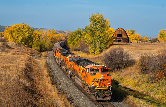 On a golden fall morning in Jens, Montana, a BNSF train glides past a popular landmark barn, surrounded by vibrant foliage and crisp skies. This perfectly portrayed scene could be a painting. Train Dispatcher Blaire Kooistra did a fantastic job capturing this photo.