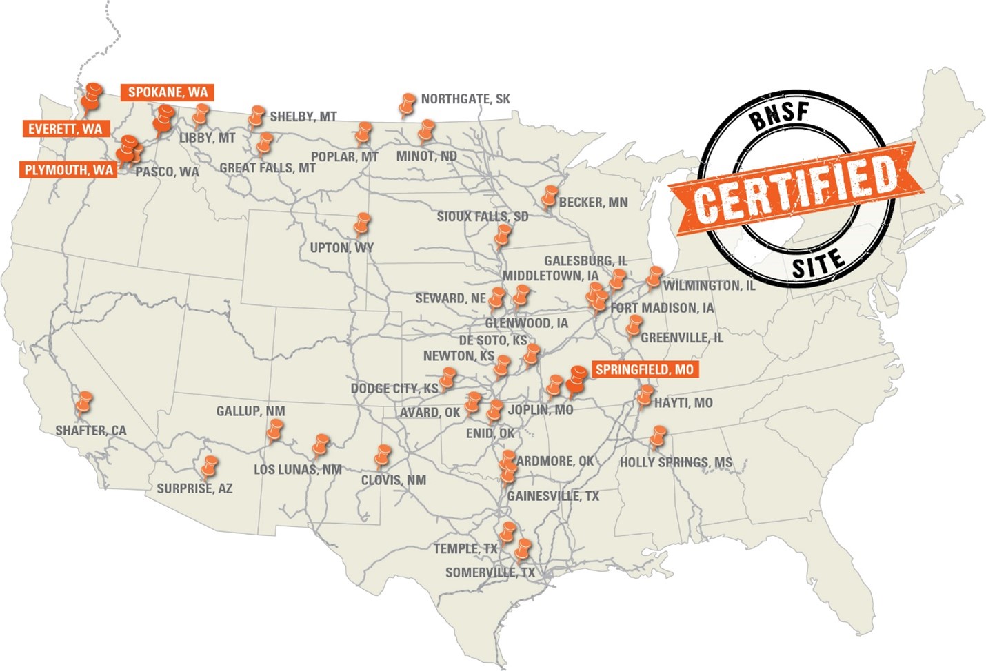 Located in Everett, Washington; Spokane, Washington; Plymouth, Washington; and Springfield, Missouri, the sites feature acreage ready for industrial development. The Certified Sites program is a strategic initiative designed to meet growing demand for rail-served, customer site locations throughout BNSF’s network.