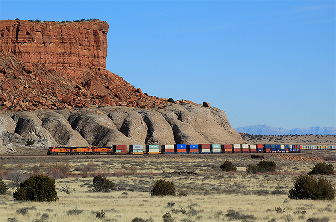 “The natural wonders of the American Southwest have a tendency to dwarf the largest of freight trains. Here, a BNSF stack train hugs the red rocks of Mesita, New Mexico, destined for the ports of Long Beach, California.”