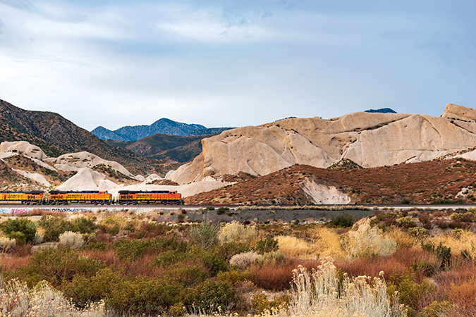 “You’ll know this landmark if you’ve driven up scenic I-15 from San Bernardino into the high desert of California. It’s called Mormon Rock and BNSF trains can be seen negotiating the steep grades here day and night. I was able to photograph in this zone during the winter of 2020, when the desert colors were eye-catching throughout the high and low landscapes.”