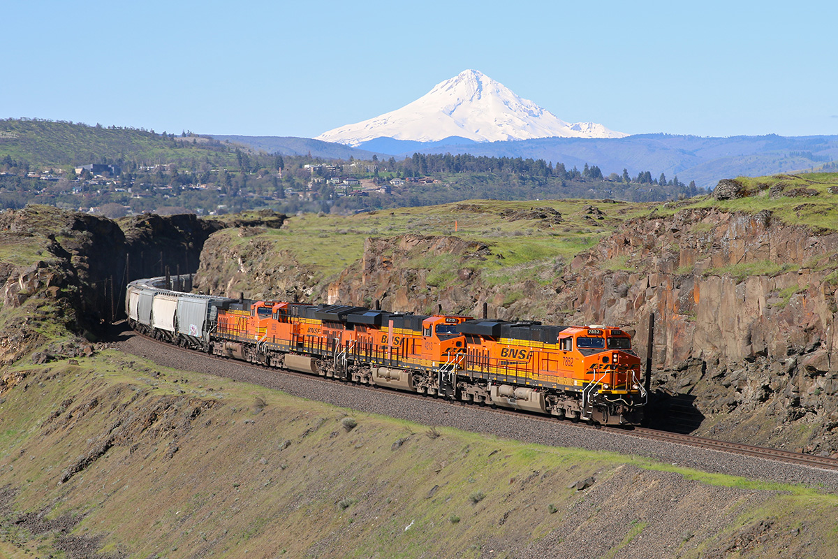 This is a photo of an eastbound BNSF train of empty grain cars taken along the Columbia River on the Fallbridge Subdivision near Dallesport, Washington, on April 21, 2019. Snow-covered Mt. Hood, Oregon's tallest peak, is seen in the distance.