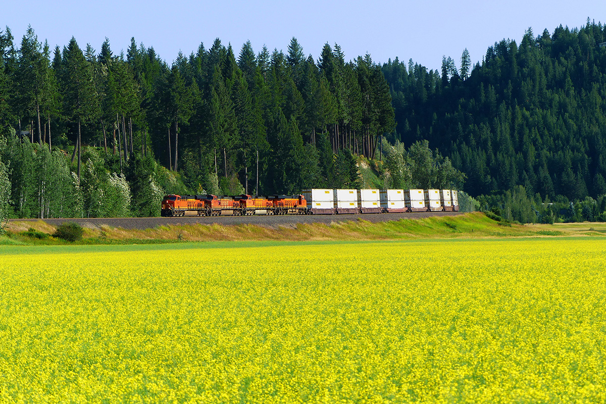 The eastbound Z-PTLCHC passes a field of Canola flowers in full bloom just outside of Bonners Ferry, Idaho, on BNSF's Kootenai River Subdivision. The bees were busy on this wonderful spring day, June 16, 2017.