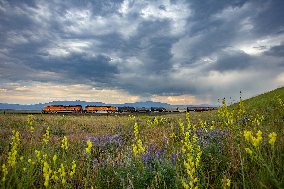 A westbound BNSF manifest freight train crawls up Winston Hill near Winston, Montana, under a dramatic big sky. A wet late spring during a normally dry period meant green hills and abundant flowers, making a colorful foreground for the photo.