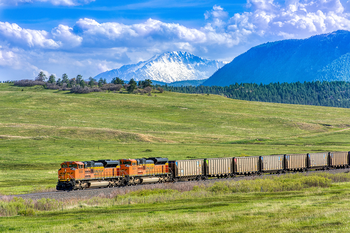 BNSF 9068 leads a northbound empty coal train just north of Palmer Lake, Colorado, on June 4, 2017.  At an elevation of 7,000 feet here, spring typically arrives rather late, with the grasses of the meadow having only recently greened up in mid-May. Pikes Peak looms above the train with deep snow still covering the mountaintop.