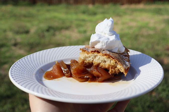 In a large bowl, gently combine apple slices, sugar and molasses. If you have a sweet tooth, consider adding an extra ¼ cup of sugar to your apple mixture. Add spices and mix it all together well. Place mixture in a baking pan and pat flat. Cover with foil and bake for 25 minutes or until apples are tender. Meanwhile, combine baking mix and milk to form a dough. Roll dough to the right size to cover the apples. Seal the edges and make slits in the top for steam to escape. Return to oven for about 20 minutes until the crust is golden brown. To serve, cut into squares and add a dollop of whipped cream.