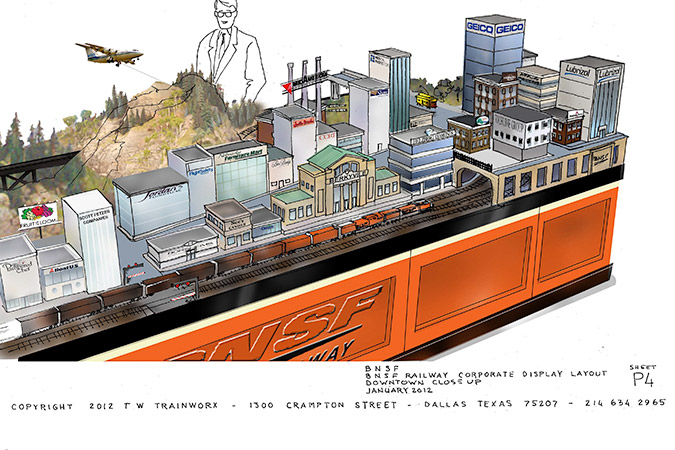 Enter Roger Farkash to take on this not-so-simple project. He and wife Dorcie are owners and creative team behind TW Design, which builds theatrical sets and trade show displays. Roger also runs TW TrainWorx, specializing in building model railroads. BNSF called him in January 2012 with the concept and specifications. Two months later, the design and track plan approved, Roger got the green light, with a construction deadline of about eight weeks.