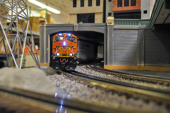 In addition to a downtown, plans called for mining operations, a coal-fired power plant, grain elevators and an intermodal yard. Three loop tracks would run over mountains and through the cityscape, tunnels and rural areas, connecting the railroad to customers – just like in real life. It would also showcase the diverse commodities BNSF handles (intermodal, merchandise, grain and coal) and run multiple trains at the same time. And with a nod to passenger operations, a union station and a streetcar were incorporated.