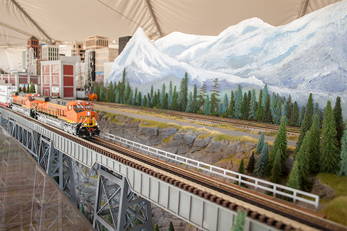 A large graphic wall displaying BNSF corporate messages is installed behind the layout. The layout typically takes about four hours to set up and another two to get trains running. Since that first year, the team has added more vignettes of people doing everyday tasks. The railcars are updated occasionally to coincide with new BNSF equipment.