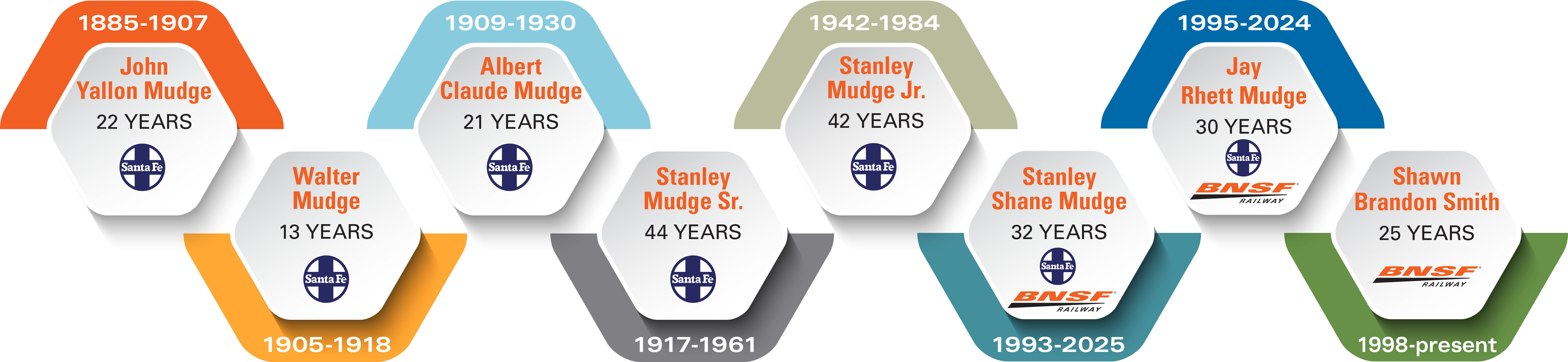 Like brother and like father, Stanley Jr.’s oldest son, Jay Rhett Mudge, joined the Santa Fe in Amarillo in 1994. Jay was promoted to locomotive engineer in 1995, assistant trainmaster in 2005 and trainmaster in 2009 – all in Amarillo. Jay is set to retire in 2024 after 30 years of service between the Santa Fe and BNSF.