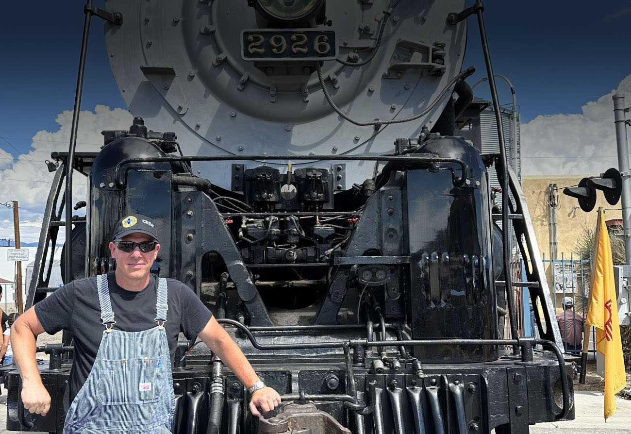 Tumbas with locomotive 7025, which was used in the Southern California Christmas Train in 2019 that he volunteered to operate.