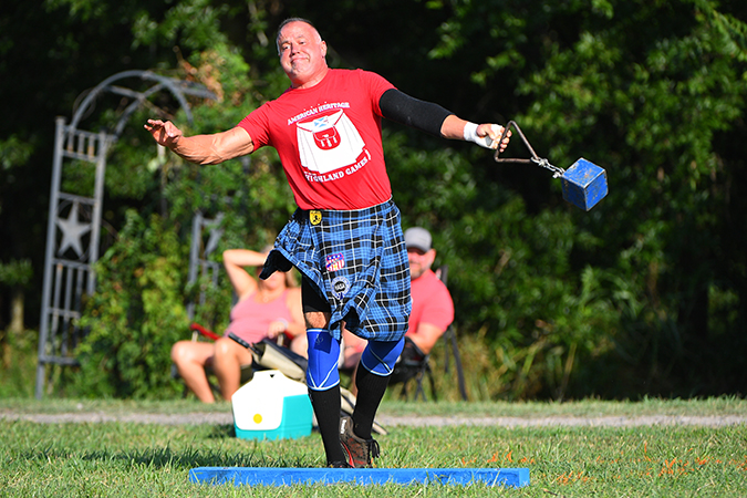 Wearing his family clan tartan, Tedd competes in the weight-for-distance event.