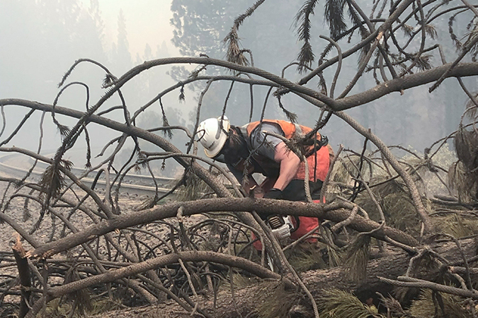 Smoke is a constant and impairs visibility; our Industrial Hygiene team has provided respirators, which are required for BNSF personnel working in the elements. There’s also the threat of large embers and ash falling. Giant trees felled by flames can crash, often across the tracks.