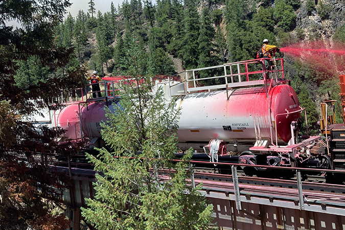 In the greatest at-risk areas, fire bladders – durable bags that can be filled with 10,000 gallons of water –and sprinkler systems are being deployed. Water and fire retardant are being sprayed, especially on bridges, to wet the crossties and structures to reduce the chance of them catching fire.