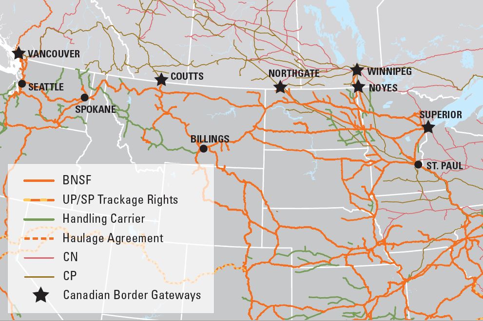 - BNSF has direct access to Canada in three provinces: British Columbia, Saskatchewan and Manitoba, with five gateways and a dozen interchange locations with either Canadian National (CN) or Canadian Pacific (CP) railroads. Through these portals and connections, Canadian customers can link to BNSF’s 32,500-route-mile network – a system that is larger than Canada’s entire rail network. In addition, BNSF connects to key shortline railroads in British Columbia: the Southern Railway of British Columbia at Sumas, Wash., and the Kettle Falls/St. Paul and Pacific Railroads at Chewelah, Wash.