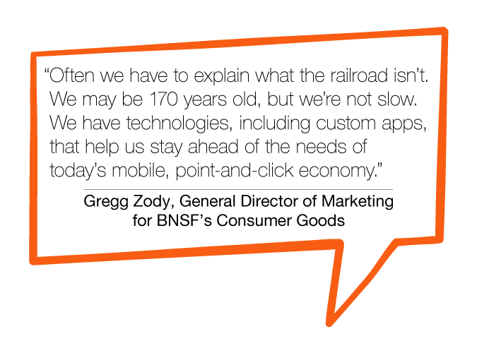 “Our job is to not only educate, but to influence the transportation decision-making for beneficial cargo owners toward more use of BNSF’s intermodal service,” explained Gregg Zody, general director for the team. “Often we have to explain what the railroad isn’t. We may be 170 years old, but we’re not slow. We have technologies, including custom apps, that help us stay ahead of the needs of today’s mobile, point-and-click economy.”