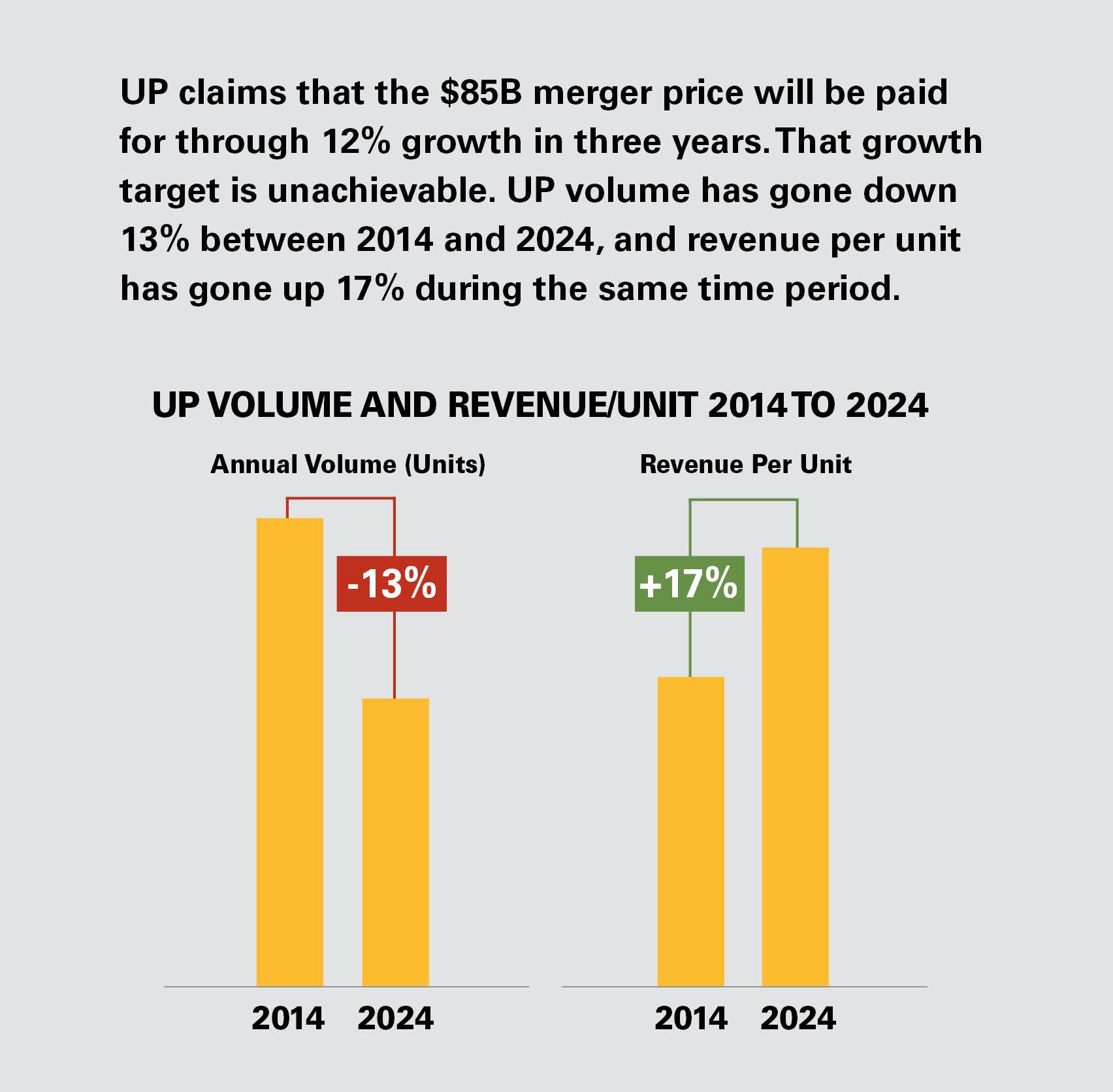 • The proposed UP-NS merger would concentrate nearly half of the nation's freight under one railroad – limiting shipper choices and reducing long-term competitiveness.